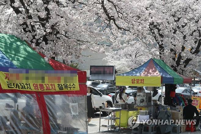 (공주=연합뉴스) 이주형 기자 = 1일 오전 충남 공주시 반포면 학봉리 동학사 일원에서 열린 계룡산 벚꽃축제장 도로 옆에 노점상들이 영업을 하고 있다. 2023.4.1