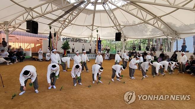 (속초=연합뉴스) 이종건 기자 = 1일 속초시립박물관 야외공연장에서 열린 무형문화재 공개행사에서 속초 도문농요가 공연되고 있다.