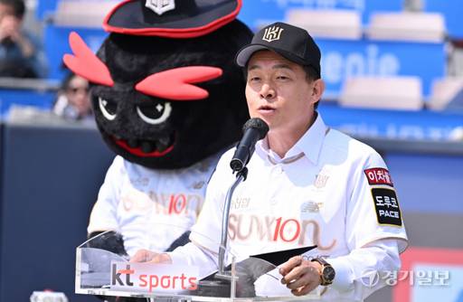 1일 수원특례시 KT위즈파크에서 열린 ‘2023 신한은행 SOL KBO리그’ KT 위즈와 LG 트윈스의 개막 경기에서 경기에 앞서 김동연 경기도지사(위)와 이재준 수원특례시장(아래)이 축사 및 개막선언을 하고 있다.