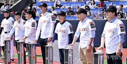 1일 수원특례시 KT위즈파크에서 열린 ‘2023 신한은행 SOL KBO리그’ KT 위즈와 LG 트윈스의 개막 경기에서 경기에 앞서 김동연 경기도지사, 염태영 경제부지사, 이재준 수원특례시장 등이 개막전 행사에 참여하고 있다.