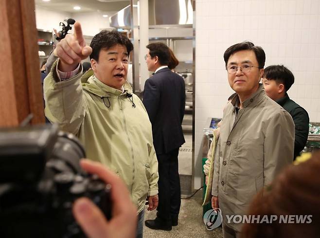 (예산=연합뉴스) 백종원 더본코리아 대표(왼쪽)와 김태흠 충남지사(오른쪽)가 1일 재개장한 충남 예산시장을 찾아 운영 상황을 둘러보고 있다. 김 지사는 이 자리에서 "급격한 방문객 증가에 따른 주차난을 해소하기 위해 예산시장에 대규모 주차타워를 건립할 수 있도록 100억 원을 지원하겠다"고 밝혔다. 2023.4.1 [충남도 제공. 재판매 및 DB 금지]