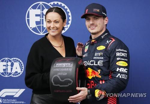 epa10553392 Dutch Formula One driver Max Verstappen (R) of Red Bull Racing is presented with the Pirelli Pole Position trophy by Australian comedienne Celeste Barber after the qualifying session of the Formula One Grand Prix of Australia at the Albert Park Circuit in Melbourne, Australia, 01 April 2023. EPA/SIMON BAKER