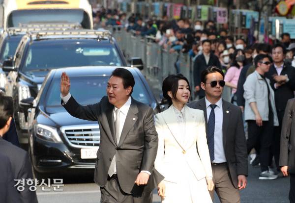 대구의 전통시장인 서문시장이 100주년을 맞은 1일 윤석열 대통령과 김건희 여사가 기념식에 참석하기 위해 시장을 방문해 시민들에게 인사하고 있다.