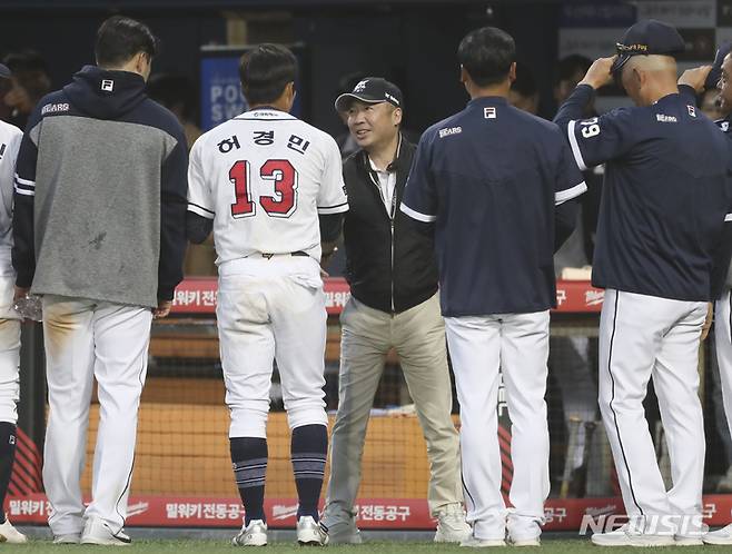 [서울=뉴시스] 김근수 기자 = 1일 오후 서울 송파구 잠실야구장에서 열린 2023 프로야구 개막전 두산 베어스 대 롯데 자이언츠의 경기 두산베어스의 12 대 10으로 승리 후 박정원 두산베어스 구단주가 선수들을 격려하고 있다. 2023.04.01. ks@newsis.com