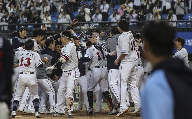 [서울=뉴시스] 김근수 기자 = 1일 오후 서울 송파구 잠실야구장에서 열린 2023 프로야구 개막전 두산 베어스 대 롯데 자이언츠의 경기, 11회 말 두산 공격, 두산 로하스가 끝내기 3점 홈런을 치고 홈에서 선수들과 기쁨을 나누고 있다. 2023.04.01. ks@newsis.com