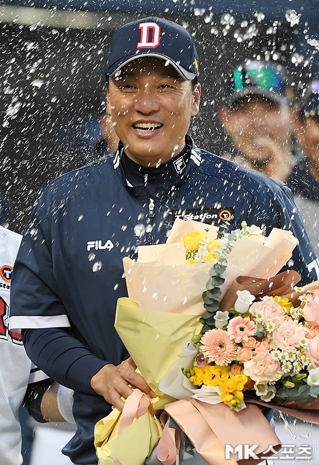 두산 이승엽 감독이 선수들에게 물세례를 받고 있다.