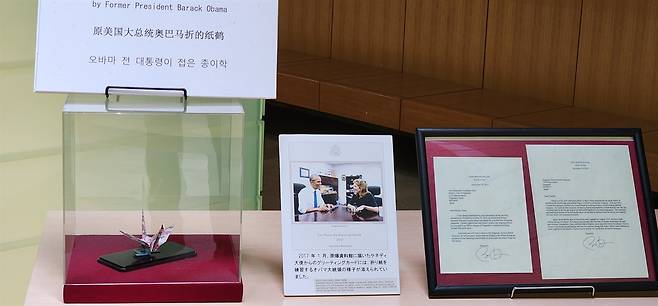 | ▲ 원폭 사망자 추도 기념관에 전시된 오바마 대통령의 종이학. 버락 오바마 전 대통령은 미국 대통령 최초로 원자폭탄 피해에 대한 애도를 표명했다. |