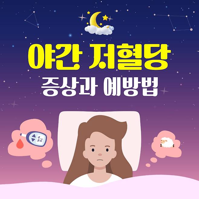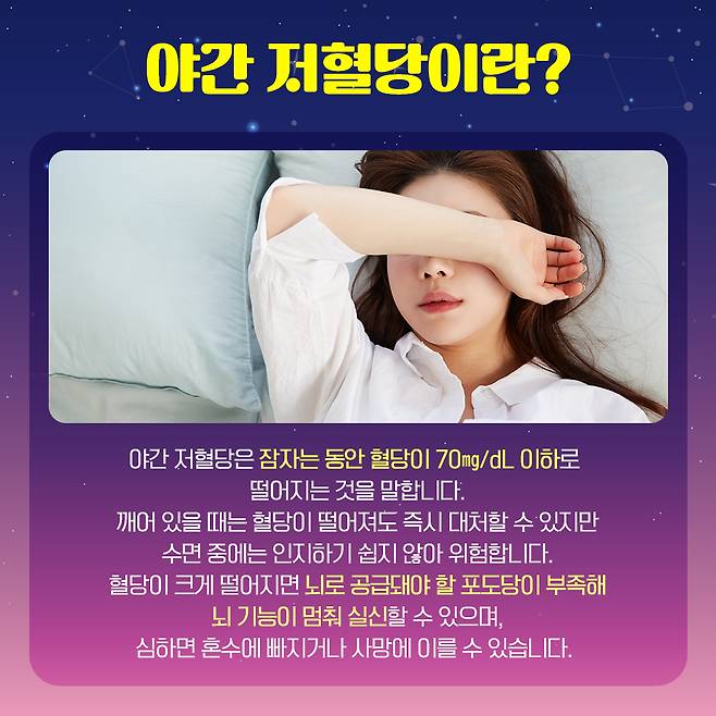 야간 저혈당은 잠자는 동안 혈당이 70㎎/dL 이하로 떨어지는 것을 말한다. 깨어 있을 때는 혈당이 떨어져도 즉시 대처할 수 있지만 수면 중에는 인지하기 쉽지 않아 위험하다. 밤에 저혈당이 온다면 자는 동안 악몽을 꾸거나 가위에 눌릴 수 있고, 식은땀이 나서 잠옷과 베개가 젖기도 한다. 아침에 일어났을 때 두통을 경험할 수도 있다.