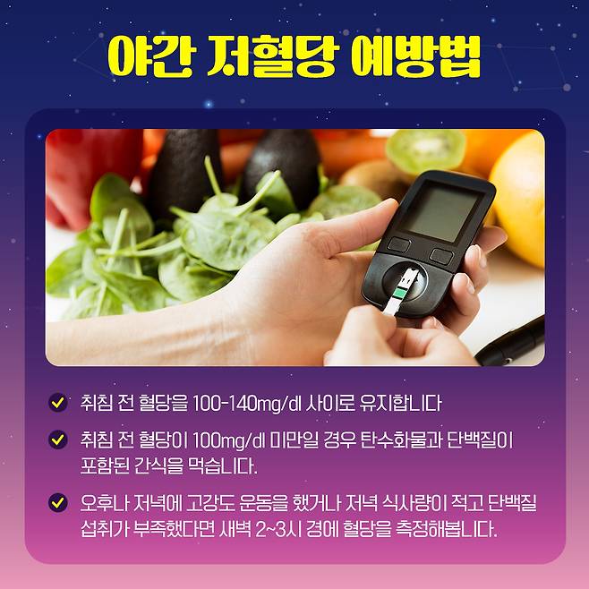 한국당뇨협회에 따르면 야간에 혈당이 70mg/dl 이하일 때는 가당 주스 반 컵 혹은 사탕 3~4개 등 저혈당 응급 식품을 즉시 섭취한다.