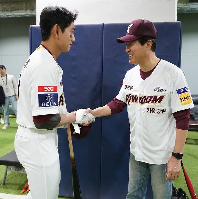 [서울=뉴시스] 김근수 기자 = 오세훈 서울시장과 이정후 키움 히어로즈 선수가 1일 고척스카이돔에서 열린 2023 KBO리그 키움 히어로즈와 한화 이글스의 개막 경기에 앞서 인사를 나누고 있다. (사진= 서울시 제공) 2023.04.01. photo@newsis.com *재판매 및 DB 금지