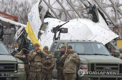 epa10553616 Ukrainian servicemen attend the handing over of ten pick-up trucks to mobile anti-drone units near the largest Ukrainian cargo aircraft Antonov An-225 Mriya 'Dream' that was destroyed during the Russian attacks on Hostomel Airfield not far from Kyiv, Ukraine, 01 April 2023 amid the Russian invasion. Mobile anti-drone units have the task to track and destroy enemy kamikaze drones and other low-flying aerial targets. Russian troops on 24 February 2022, entered Ukrainian territory, starting a conflict that has provoked destruction and a humanitarian crisis. EPA/SERGEY DOLZHENKO