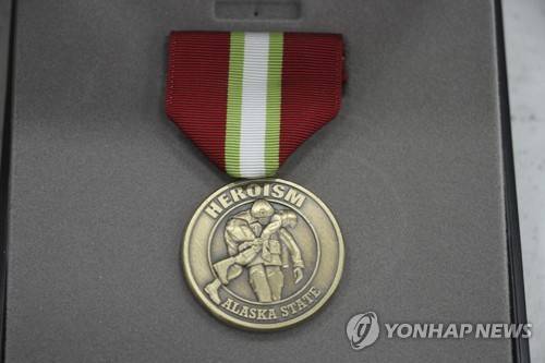 This March 28, 2023, photo shows an Alaska Heroism Medal prior to a ceremony in Gambell, Alaska, to honor 16 Alaska National Guard members. The guardsman rescued 11 Navy crewman who were injured when they crash landed on St. Lawrence Island after being shot down by Soviet MiG-15 jet fighters on June 22, 1955. (AP Photo/Mark Thiessen)