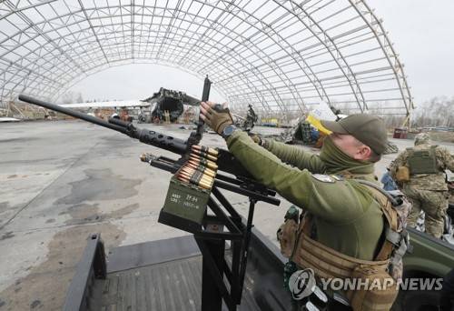 epa10553623 A Ukrainian serviceman handles a machine gun during the handing over of ten pick-up trucks to mobile anti-drone units near the largest Ukrainian cargo aircraft Antonov An-225 Mriya 'Dream' that was destroyed during the Russian attacks on Hostomel Airfield not far from Kyiv, Ukraine, 01 April 2023 amid the Russian invasion. Mobile anti-drone units have the task to track and destroy enemy kamikaze drones and other low-flying aerial targets. Russian troops on 24 February 2022, entered Ukrainian territory, starting a conflict that has provoked destruction and a humanitarian crisis. EPA/SERGEY DOLZHENKO