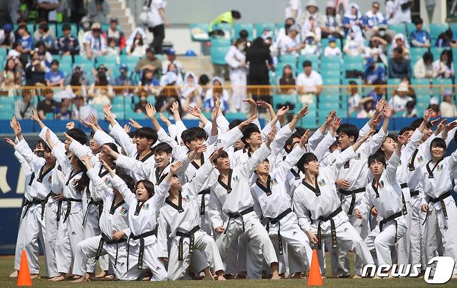 (대구=뉴스1) 공정식 기자 = 1일 오후 대구 삼성라이온즈파크에서 열린 프로야구 '신한은행 SOL 2023 KBO리그' NC 다이노스와 삼성 라이온즈의 시즌 개막전에서 대경대학교 태권도시범단이 축하공연을 선보이고 있다. 2023.4.1/뉴스1