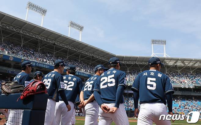 (대구=뉴스1) 공정식 기자 = 1일 오후 대구 삼성라이온즈파크에서 열린 프로야구 '신한은행 SOL 2023 KBO리그' NC 다이노스와 삼성 라이온즈의 시즌 개막전에서 NC 선수들이 그라운드로 나가고 있다. 2023.4.1/뉴스1