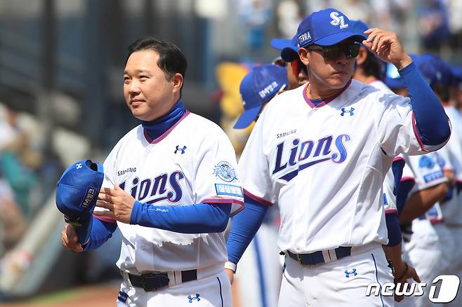 (대구=뉴스1) 공정식 기자 = 1일 오후 대구 삼성라이온즈파크에서 열린 프로야구 '신한은행 SOL 2023 KBO리그' NC 다이노스와 삼성 라이온즈의 시즌 개막전에서 삼성 박진만 감독과 이병규 코치가 개막행사에 참석하고 있다. 2023.4.1/뉴스1