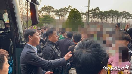 김 감독이 탄 버스는 움직이지 않았다. 30분 더 대치가 이어졌다. 결국 김 감독과 코칭스태프는 잠시 내렸다가 다시 버스에 올라타기 전 팬들과 마주했다.