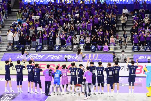 [마이데일리 = 인천 곽경훈 기자] 대한항공이 1일 오후 인천 계양체육관에서 진행된 '도드람 2022-2023 V-리그'챔피언결정전 2차전 현대캐피탈 경기에서 세트 스코어 3-0(25-20 25-22 25-22)으로 승리한 뒤 팬들에게 인사를 하고 있다.