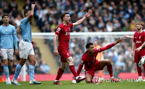 epa10553662 Diogo Jota and Cody Gakpo (bottom) of Liverpool demand a yellow card for Rodri (2-L) of Manchester City following a fould on Gakpo during the English Premier League soccer match between Manchester City and Liverpool FC in Manchester, Britain, 01 April 2023. EPA/Adam Vaughan EDITORIAL USE ONLY. No use with unauthorized audio, video, data, fixture lists, club/league logos or 'live' services. Online in-match use limited to 120 images, no video emulation. No use in betting, games or single club/league/player publications