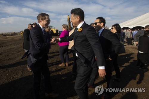 FILE - Lt. Gov. David Toland greets Panasonic president Kazuo Tadanobu before a groundbreaking ceremony for the companies newest battery plant in De Soto, Kan., Nov. 2, 2022. States are giving out more cash than ever before to multibillion-dollar microchip foundries and electric vehicle and battery factories, inspiring ever-more competition as states dig deeper into their pockets to attract big employers and capitalize on a wave of huge new projects. (Evert Nelson/The Capital-Journal via AP, File) MANDATORY CREDIT; NO LICENSING EXCEPT BY AP COOPERATIVE MEMBERS