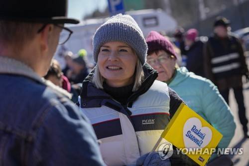 Finns Party leader Riikka Purra meets supporters during a campaign rally in Kirkkonummi, Finland, Saturday, April 1, 2023. A parliamentary election in Finland on Sunday is shaping up as an extremely close race between three parties as Prime Minister Sanna Marin's Social Democrats fight to secure a second term running the government. (AP Photo/Sergei Grits)