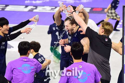 24득점을 올리며 팀 승리를 이끈 링컨이 토미 틸리카이넨 감독과 선수들에게 물세례를 받고 있다.