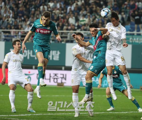 대전 조유민과 서울 박동진이 공중볼 다툼을 하고있다.