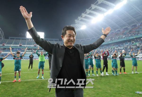 대전이 3-2로 승리했다. 경기종료후 이민성 감독이 팬들앞에서 승리 세리머니 하고있다.