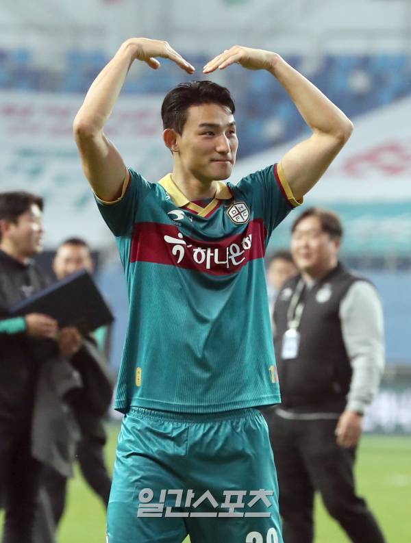 대전이 3-2로 승리했다. 경기종료후 조유민이 팬들에게 하트 세리머니 하고있다.