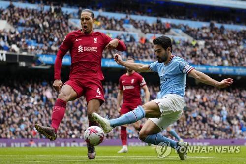 Manchester City's Ilkay Gundogan, right, scores his his side's third goal, challenged by Liverpool's Virgil van Dijk during the English Premier League soccer match between Manchester City and Liverpool at Etihad stadium in Manchester, England,Saturday, April 1, 2023. (AP Photo/Jon Super)