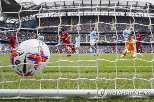 Liverpool's Mohamed Salah, center left celebrates after scoring his side's opening goal during the English Premier League soccer match between Manchester City and Liverpool at Etihad stadium in Manchester, England, Saturday, April 1, 2023. (AP Photo/Jon Super)