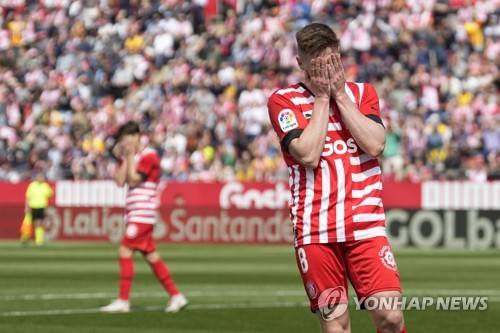epa10553690 Viktor Tsygankov of Girona reacts during the LaLiga Santander (First Division) soccer match between Girona and Espanyol at Montilivi Stadium in Girona, Spain, 01 April 2023. EPA/DAVID BORRAT