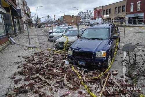 Bricks litter the sidewalk at the scene where the roof of the Apollo Theatre collapsed during a tornado, Saturday, April 1, 2023, in Belvidere, Ill. Belvidere Fire Chief Shawn Schadle said 260 people were in the venue. Responders also rescued someone from an elevator and had to deal with downed power lines outside the theater.(AP Photo/Erin Hooley)