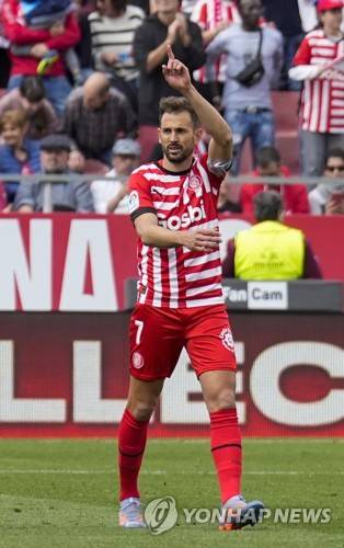 epa10553790 Girona's Uruguayan striker Cristhian Stuani celebrates after scoring the 2-1 during the LaLiga Santander soccer match between Girona and Espanyol at Montilivi Stadium in Girona, Spain, 01 April 2023. EPA/DAVID BORRAT