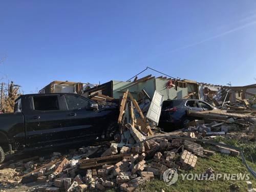A home and vehicle is damaged from a storm in Little Rock, Ark., on Saturday, April 1, 2023. Unrelenting tornadoes that tore through parts of the South and Midwest that shredded homes and shopping centers. (AP Photo/Andrew DeMillo)