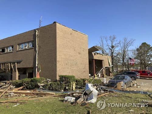 Debris covers the ground around a damaged fire station in Little Rock, Ark., on Saturday, April 1, 2023. Unrelenting tornadoes that tore through parts of the South and Midwest that shredded homes and shopping centers. (AP Photo/Andrew DeMillo)