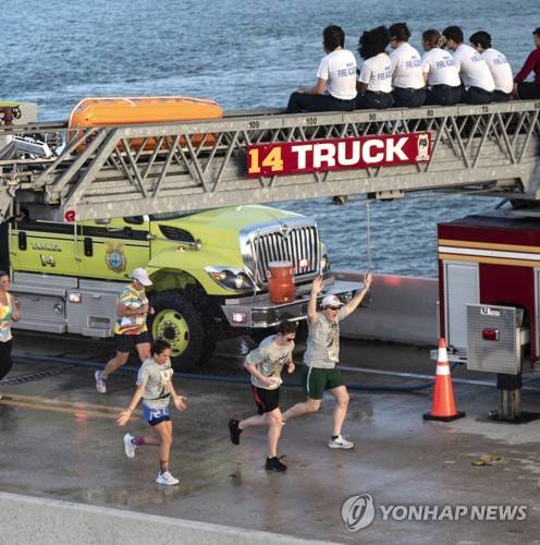 In this photo provided by the Florida Keys News Bureau, entrants in the annual Seven Mile Bridge Run are cooled by spray nozzles as they run under a City of Marathon fire truck's ladder Saturday, April 1, 2023, near Marathon, Fla. The annual event attracted 1,500 runners that traversed the longest of 42 bridges over water that help comprise the Florida Keys Overseas Highway. Joanna Stephens, 28, of Atlanta won the overall women's title and Vaclav Bursa, 15, of Big Pine Key, Fla., won the overall men's division. (Andy Newman/Florida Keys News Bureau via AP) AP PROVIDES ACCESS TO THIS HANDOUT PHOTO TO BE USED SOLELY TO ILLUSTRATE NEWS REPORTING OR COMMENTARY ON THE FACTS OR EVENTS DEPICTED IN THIS IMAGE. THIS IMAGE MAY ONLY BE USED FOR 14 DAYS FROM TIME OF TRANSMISSION; NO ARCHIVING; NO LICENSING NO SALES.