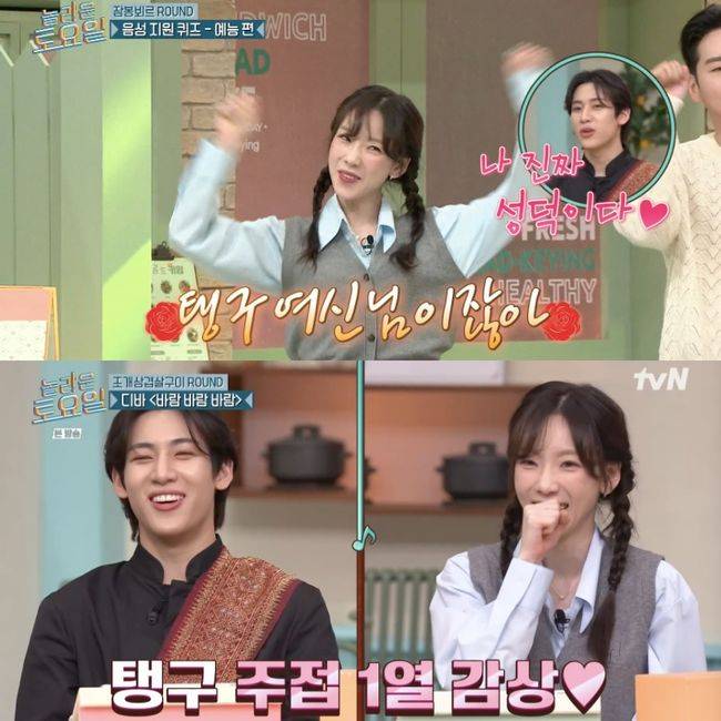 간식 게임에서는 ‘음성 지원 퀴즈’ 예능 편으로 대결이 펼쳐진 상황. 태연이 홍진경의 ‘어머 저거 뭐야’를 맞춰 가장 먼저 간식을 획득했고, 원더걸스의 ‘텔미’가 나오자 완벽하게 춤을 재연했다. 이에 뱀뱀은 “나 진짜 성덕이다”라며 감탄한 반면, 데프콘은 “나는 제수 씨가 그냥 중얼거린 말인 줄 알았다”라며 과거 정형돈과 ‘우리 결혼했어요’ 찍었던 당시를 언급해 웃음을 줬다.