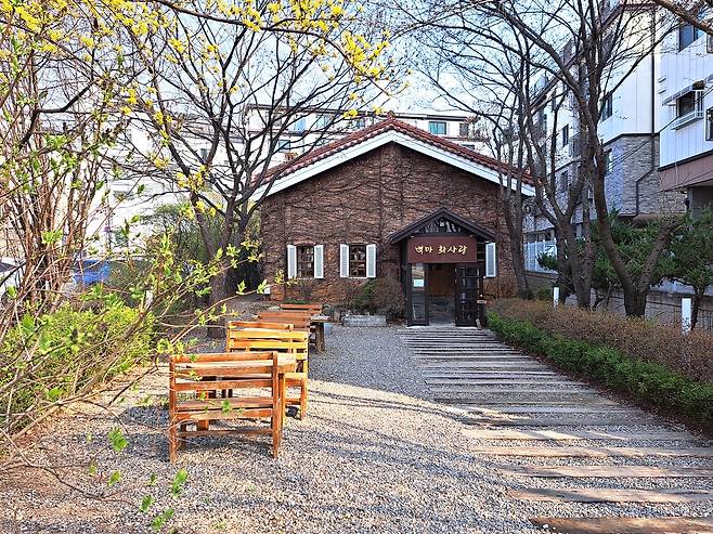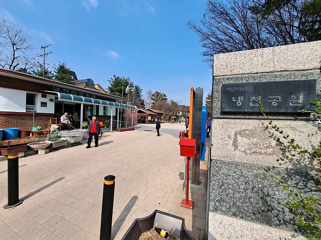 | ▲ 냉천공원 백마 카페촌의 한 부분을 이루던 옛 냉천마을이 흔적으로 남은 냉천공원과 마을 회관. |