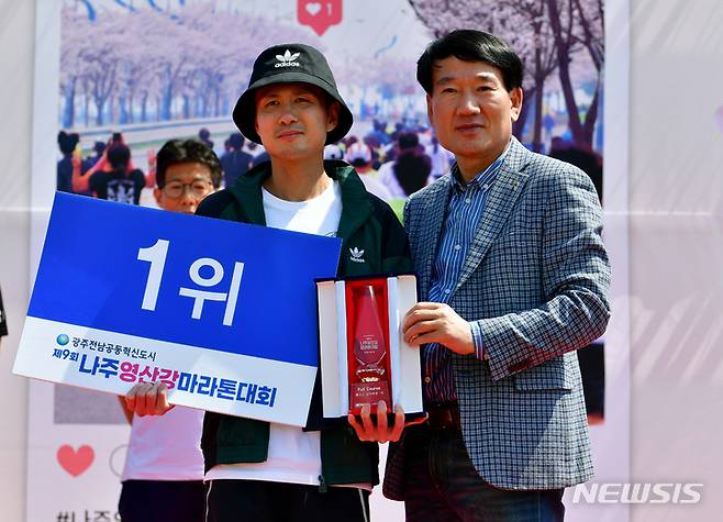 [광주=뉴시스] 이영주 기자 = 2일 오전 전남 나주시 나주종합스포츠파크에서 열린 뉴시스 광주전남본부 주최·나주 마라톤동호회 주관 '제9회 나주영산강마라톤대회', 풀코스 1위 마성민(40)씨가 기념촬영을 하고 있다. 2023.04.02. leeyj2578@newsis.com