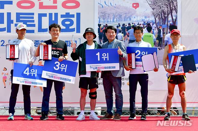 [광주=뉴시스] 이영주 기자 = 2일 오전 전남 나주시 나주종합스포츠파크에서 열린 뉴시스 광주전남본부 주최·나주 마라톤동호회 주관 '제9회 나주영산강마라톤대회', 풀코스 순위권 완주 마라토너들이 기념사진을 촬영하고 있다. 2023.04.02. leeyj2578@newsis.com