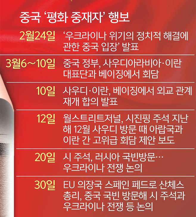 중동에서의 성공에 고무된 중국은 내친김에 그간 은근히 러시아 편을 들며 지켜보고 있던 우크라이나 전쟁 개입을 시도 중이다.