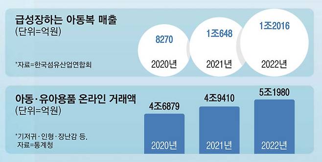 특히 온라인 거래가 꾸준히 늘고 있다. 기저귀, 유모차, 보행기, 장난감 등 아동·유아용품의 경우 온라인 거래액이 지난해 5조1980억원을 기록했는데, 이는 전년 대비 5.2% 늘어난 수치였다. 지난해 출생아가 약 26만명으로 역대 최저치를 기록했지만 시장 규모는 되레 커졌다.