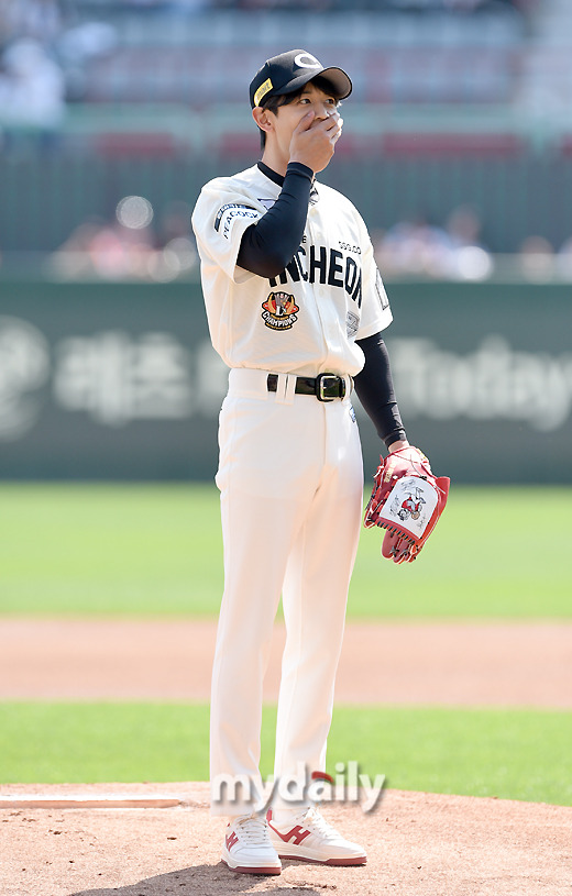 [마이데일리 = 인천 유진형 기자] 샤이니 민호가 2일 오후 인천 SSG랜더스필드에서 진행된 '2023 신한은행 SOL KBO리그' KIA 타이거즈와 SSG 랜더스의 경기가 시작되기 전 시구를 한 뒤 깜짝 놀라고 있다.