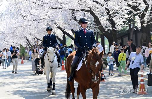 초여름 날씨를 보인 2일 과천시 렛츠런파크 서울에서 열린 벚꽃축제에 많은 관람객들이 몰린 가운데 한국마사회 승용마가 인기를 끌고 있다.
