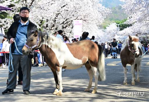 초여름 날씨를 보인 2일 과천시 렛츠런파크 서울에서 열린 벚꽃축제에서 미니말 포니가 관람객들에게 인기를 끌고 있다. 다양한 말 관련 체험과 전시, 공연이 마련된 이번 축제는 오는 9일까지 열린다.