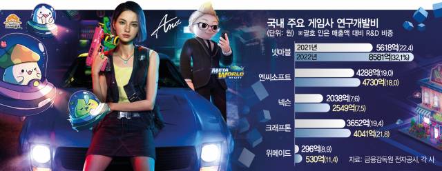 2일 서울경제신문이 ‘3N’으로 불리우는 넥슨·엔씨소프트(036570)·넷마블(251270)과 크래프톤(259960)·위메이드(112040) 등 국내 주요 게임사들의 사업보고서를 분석한 결과 지난해 이들 기업은 매출의 평균 20% 가까이를 R&D에 투자했다. 넷마블은 8581억 원을 R&D에 투입해 매출액 대비 비중이 32.1%에 달했다. 넷마블은 “2021년 소셜 카지노 업체 '스핀엑스' 인수에 따른 개발 인력 흡수 등 비용이 늘어난 영향”이라면서 “게임 수명을 연장해 매출 증대로 이어질 수 있는 AI 기술에 가장 많이 투자하고 있다"고 말했다.
