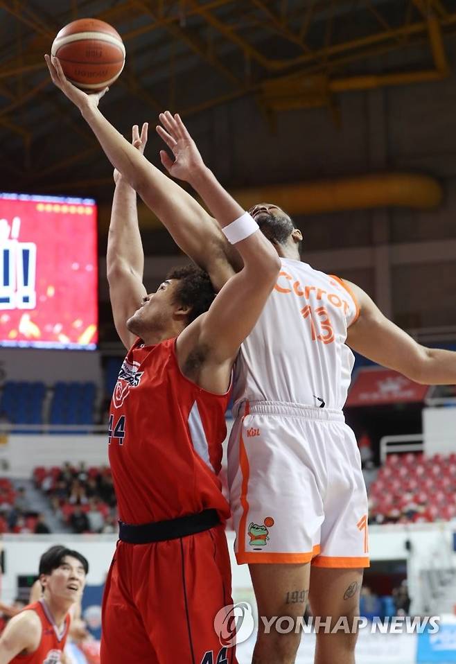 (울산=연합뉴스) 김용태 기자 = 2일 울산 동천체육관에서 열린 2022-2023 SKT 에이닷 프로농구 6강 플레이오프 울산 현대모비스와 고양 캐롯의 1차전에서 캐롯 로슨이 현대모비스 프림과의 리바운드 싸움에서 공을 따내고 있다. 2023.4.2