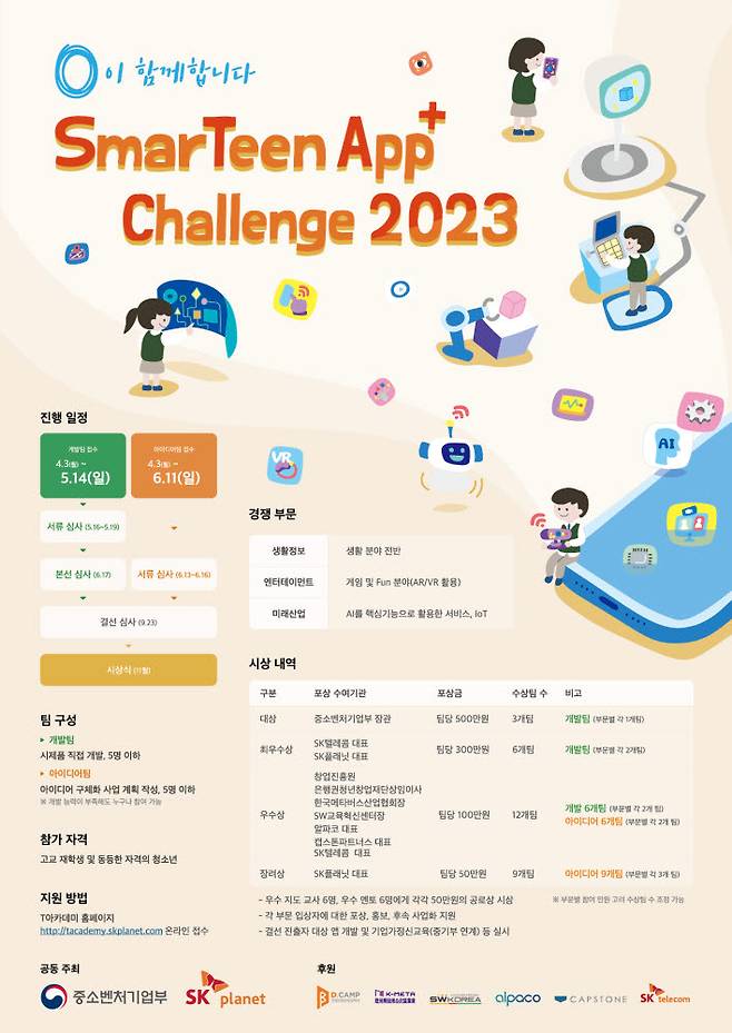 SK플래닛이 중소벤처기업부와 앱 개발 경진대회 '스마틴 앱 챌린지 2023'을 개최한다. 개발 분야는 5월 14일, 아이디어 분야는 6월 11일까지 참가자를 모집한다.