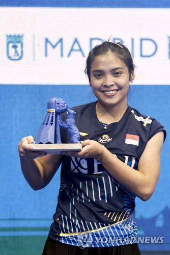 epa10555357 Gregoria Mariska Tunjung of Indonesia celebrates winning the women's final at the Madrid Spain Badminton Masters in Madrid, Spain, 02 April 2023. EPA/SERGIO PEREZ